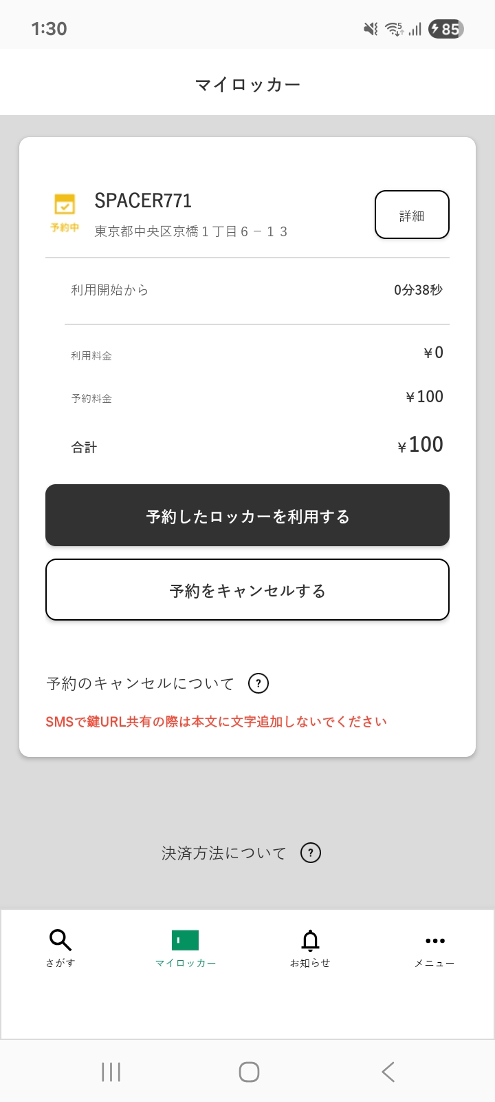 SPACERアプリ内のマイロッカーより下記の手順で予約のキャンセルが可能です。