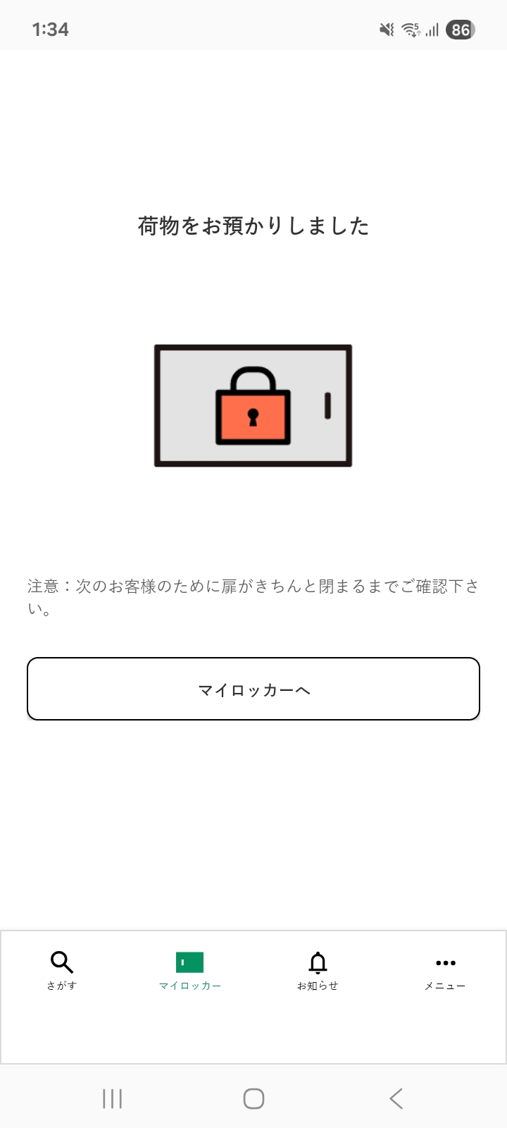 鍵がかかったことを確認し、預け入れ完了
